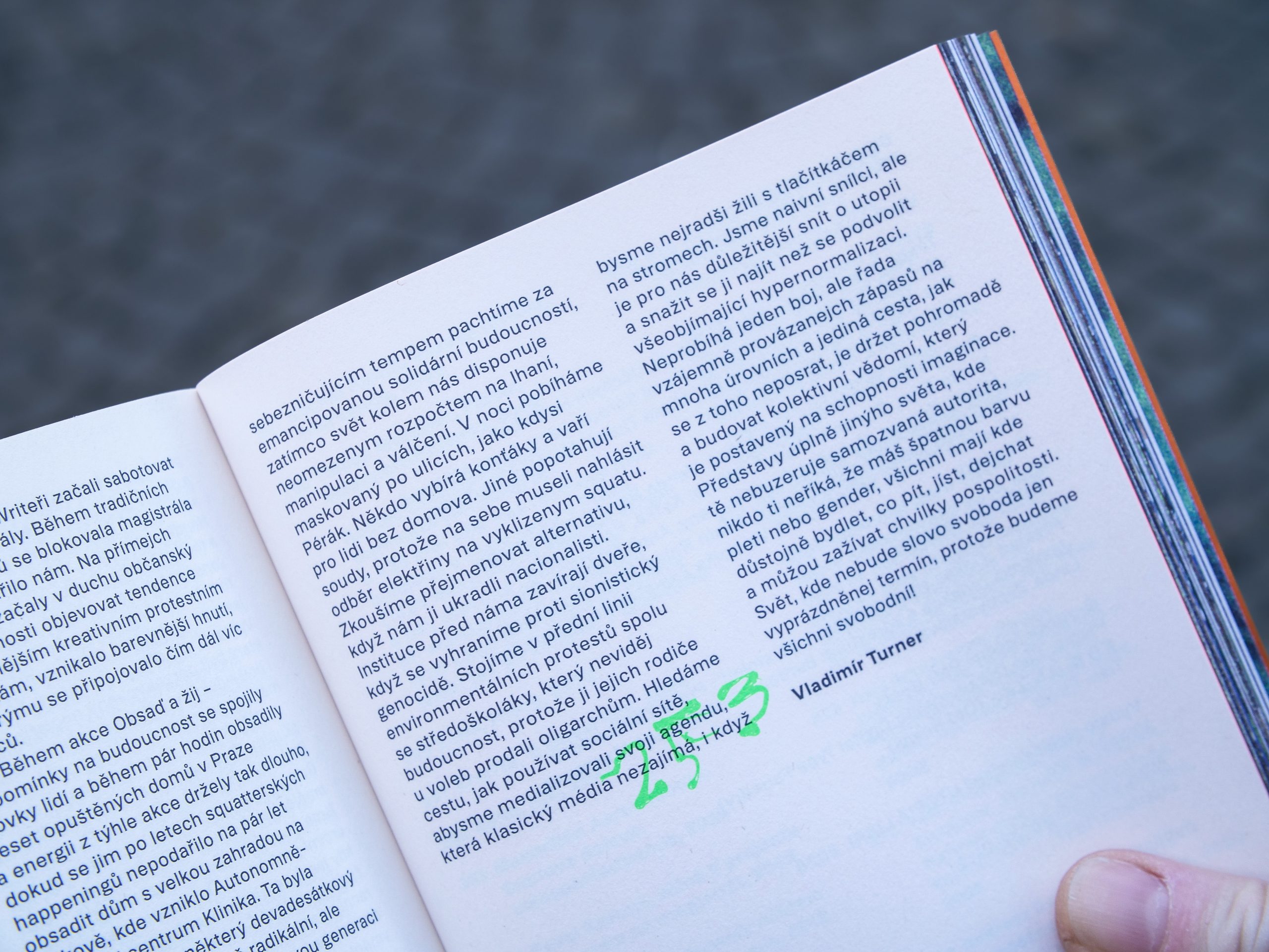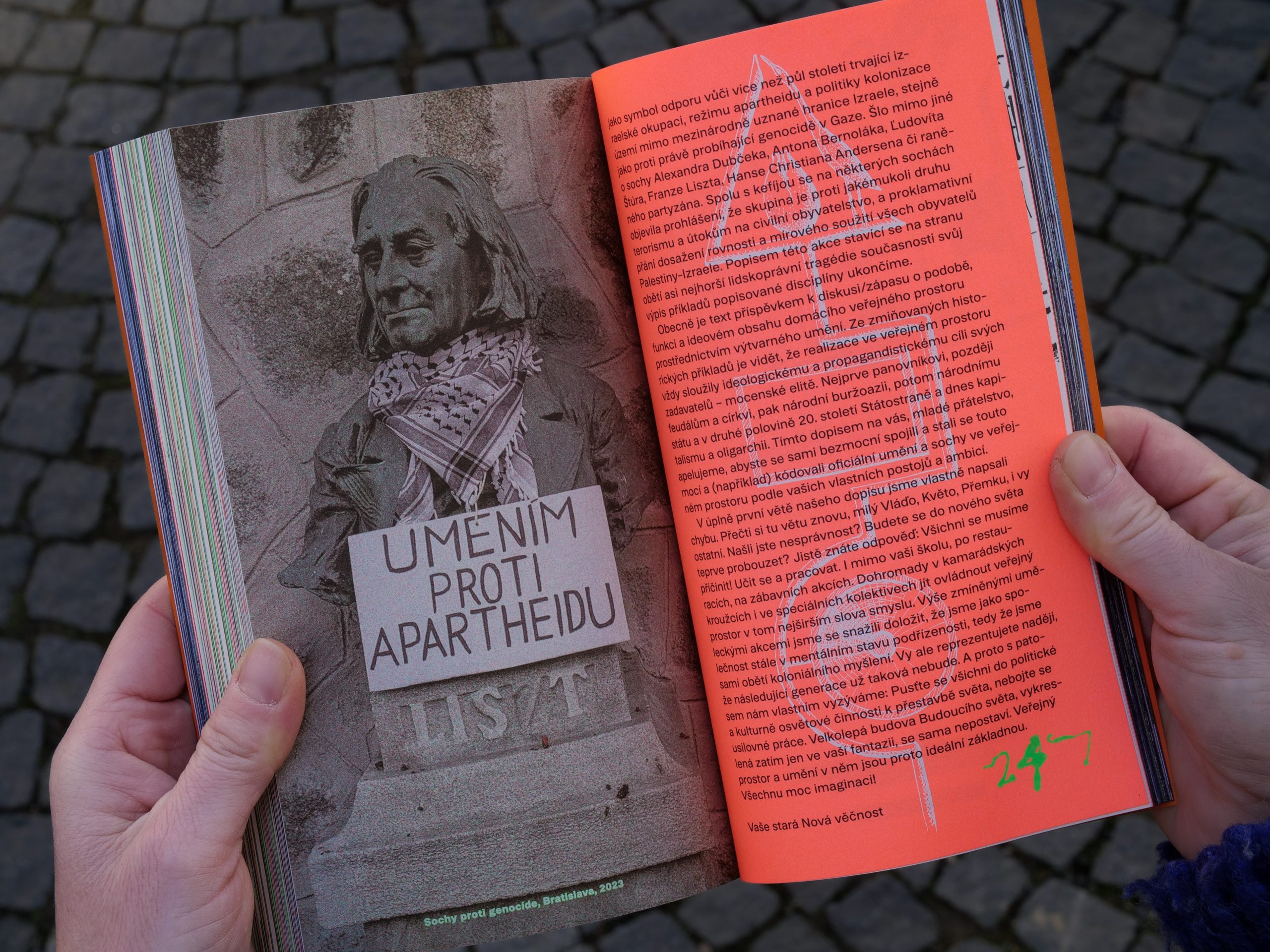 Artworks: Agentura Decentralizace luxusu, Akay, Darina Alster, Vasil Artamonov, Avanti Garda, Miloš Axman, Dalibor Bača, Bolt 958, Michelangelo Buonarroti, Emma Cozzani, Kryštof Doležal, Brad Downey, Dorka Dutková, Epos 257, Extinction Rebellion, Fridays For Future, Václav Frýdecký, Vojtěch Fröhlich, Fuki, Andreas Gajdošík, Jakub Geltner, Jan Glín, Gufrau, George Hladík, Lada Holoubek, Jezevky, Eva Jiřička, Tomáš Kajánek, Pavel Karous, Keim, Alexey Klyuykov, Michal Kohút, Deana Kolenčíková, Lucie Kordačová, Marek Kroupa, Krstftb, Josef Malejovský, Jan Martinec, Ondřej Mladý, Maxmilián Aaron Mootz, Tomáš Moravec, Slavoj Nejdl, Nová věčnost, Osvobozený Biograf, Pes, @pespectiv, Tadeáš Polák, Jitka Pospíšilová, Jiří Prádler, Nicolas Prokop, David Přílučík, Punx23, Redskate, Rudolf Samohejl, SHLUK, Jan Simota, Jonáš Strouhal, Jan Šimánek, Mathieu Tremblin, Vladimír Turner, Lenka Tyrpeklová, Vladimír 518, Ivan Vosecký, Martin Zet